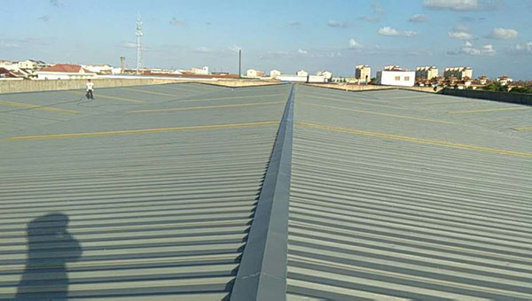 底漆:將聚合物室外工程專用防水涂料倒入攪拌桶中,用電動(dòng)攪拌機(jī)攪拌均勻(約3-5分鐘),在彩鋼瓦片連接處10-20厘米寬處,螺釘周圍(半徑5-10厘米),彩鋼瓦與墻壁接觸處10-20厘米處,用毛刷刷防水涂料。厚度應(yīng)均勻一致。打底后,厚度應(yīng)保持在0.3毫米左右。修補(bǔ)后,可進(jìn)行下一道工序。